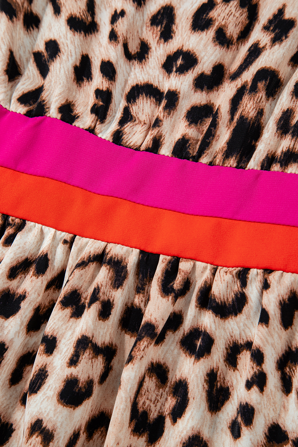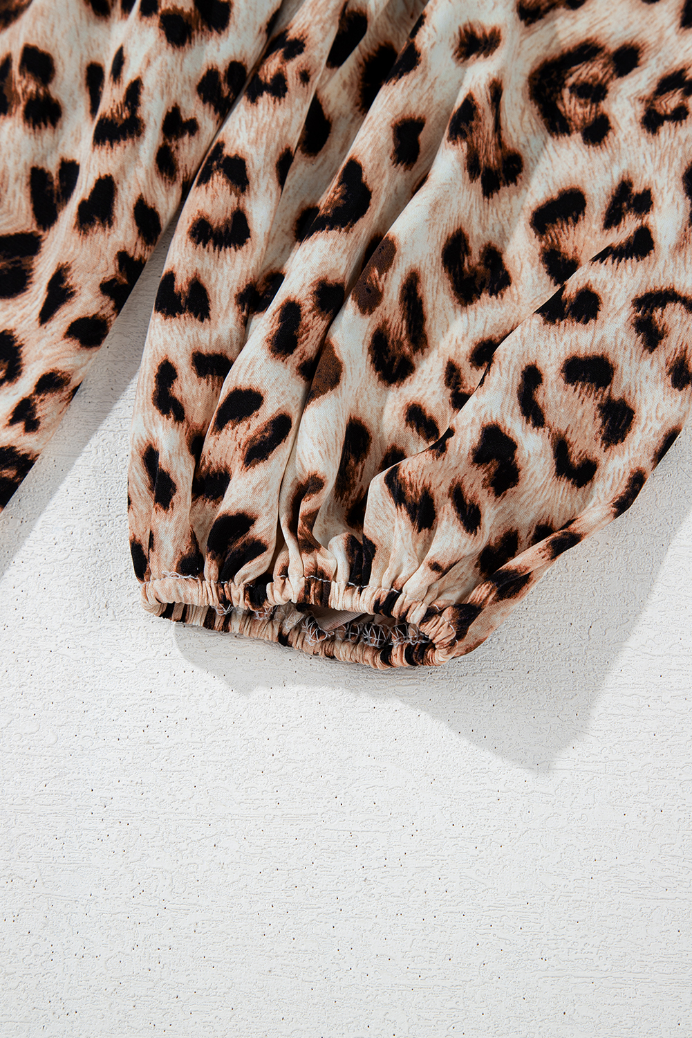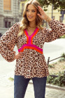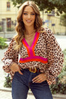 Blusa babydoll con manga globo y cuello en V con bloques de color guepardo caqui