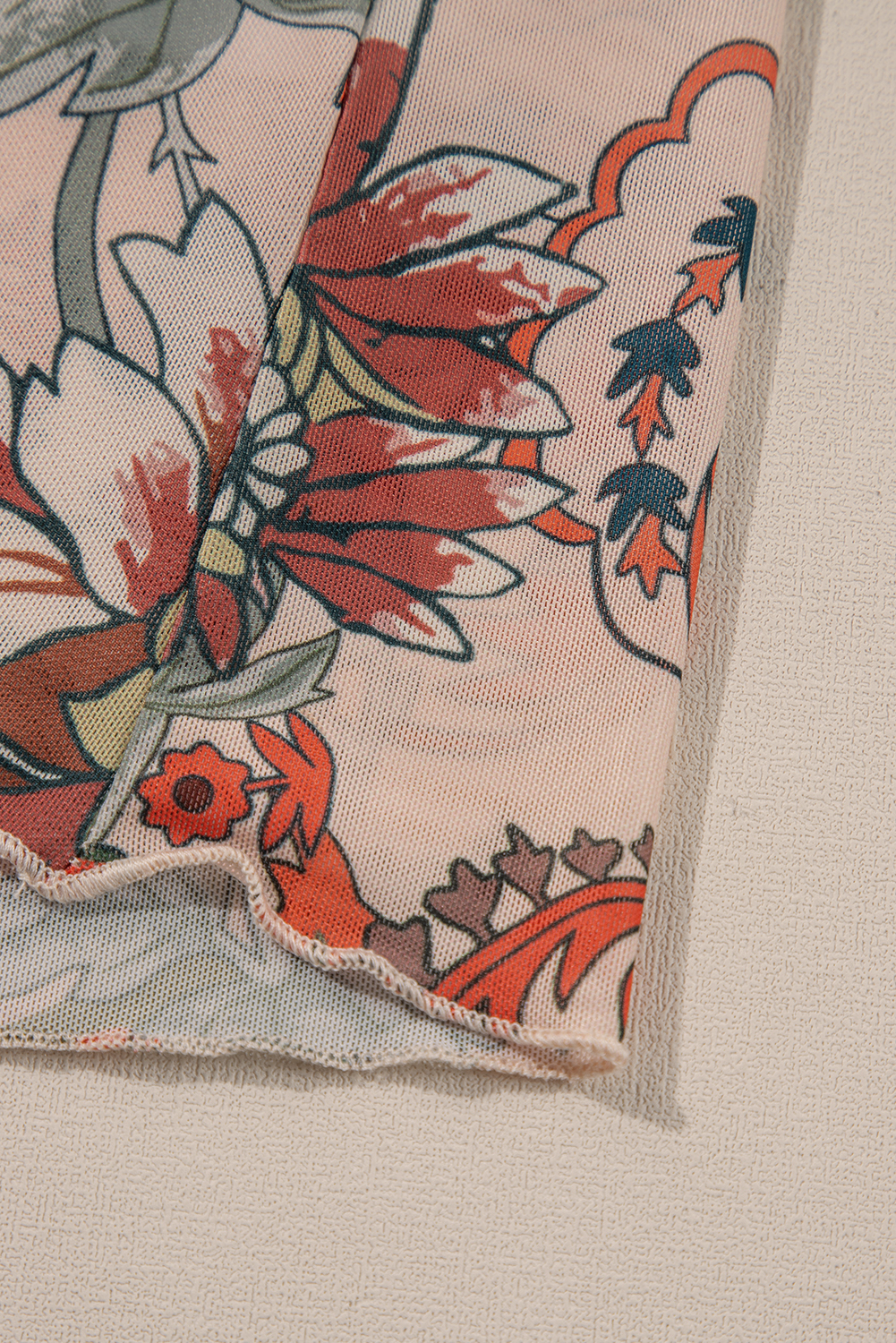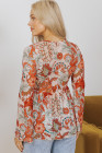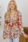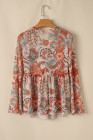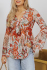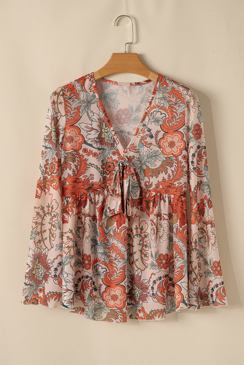 Blusa con escote en V profundo, mangas acampanadas y nudo y estampado floral naranja