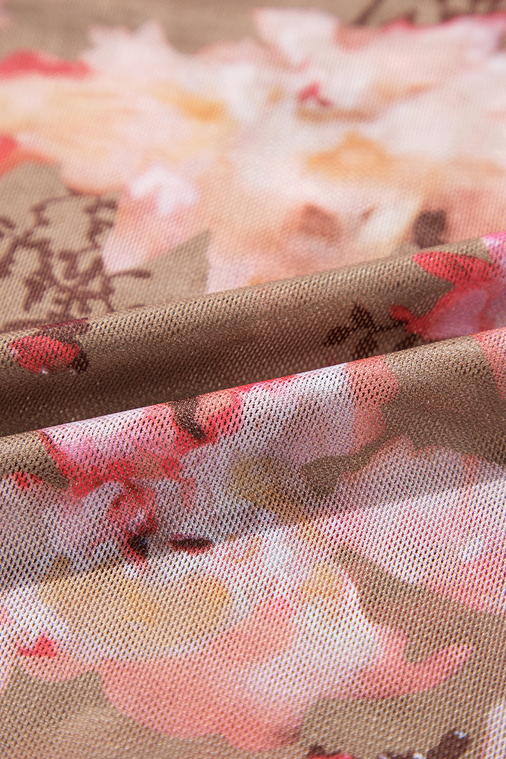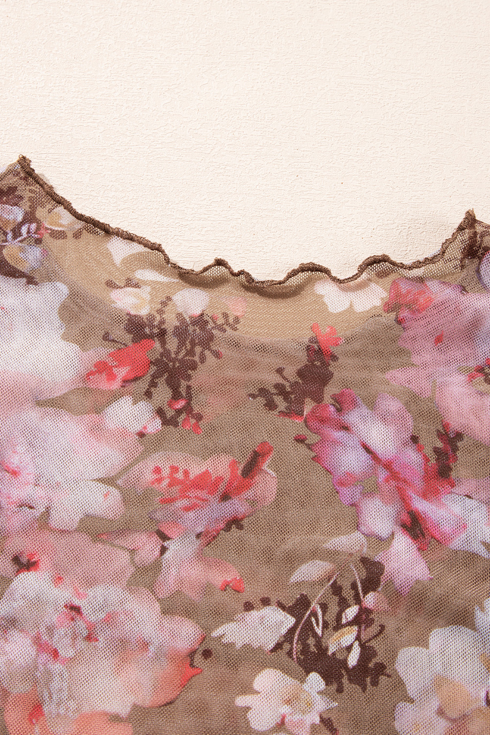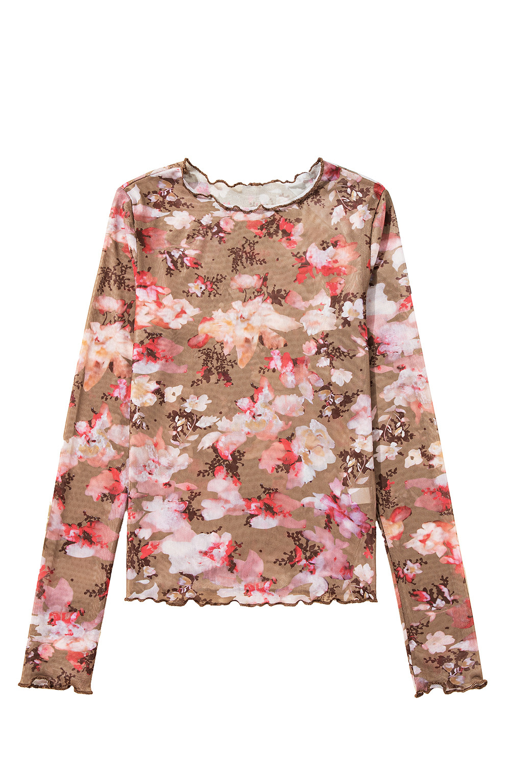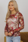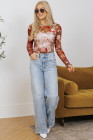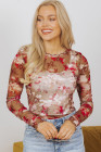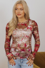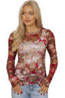 Blusa de manga larga de malla transparente con estampado floral rojo