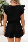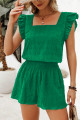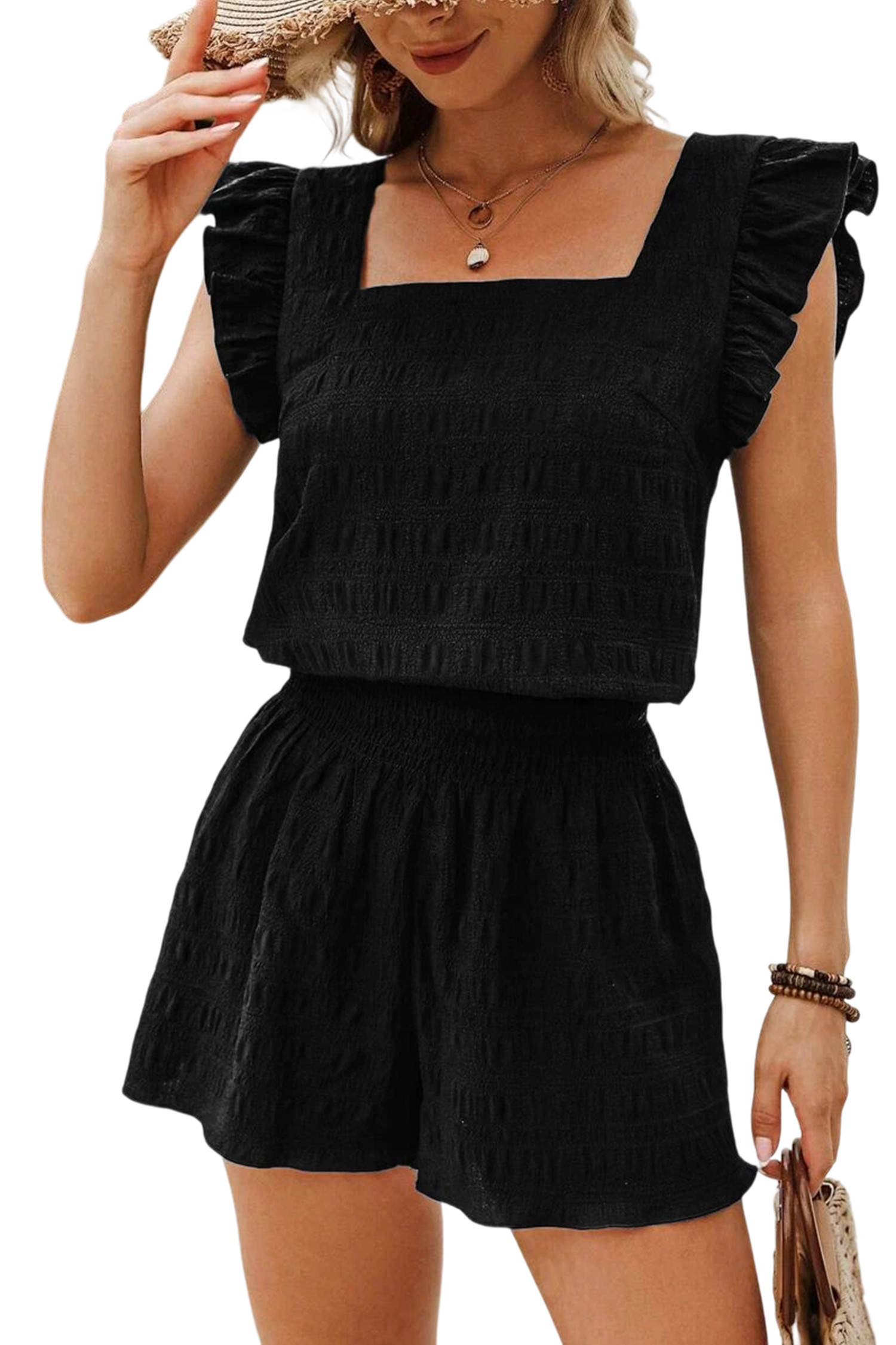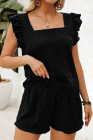 Conjunto de top negro texturizado con escote cuadrado y pantalones cortos fruncidos de cintura alta