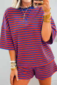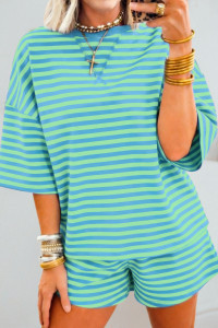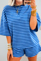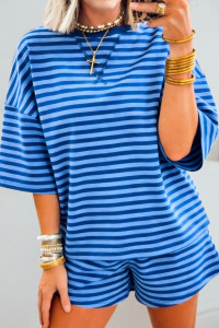Conjunto informal de pantalón corto y jersey de manga larga con hombros caídos y cintura elástica a rayas azules