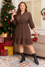 Vestido mini con textura, cuello en V, mangas abullonadas y ribete de volantes en color café, talla grande