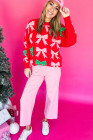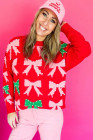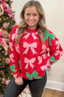 Suéter navideño adornado con perlas y lazo rojo fuego
