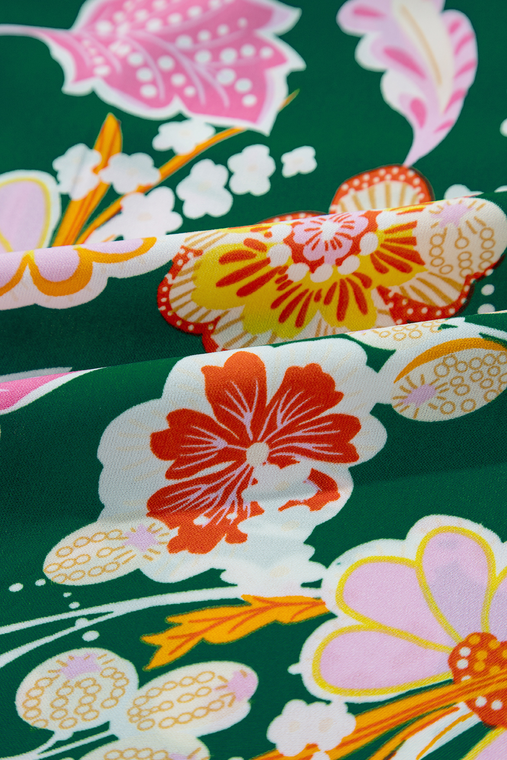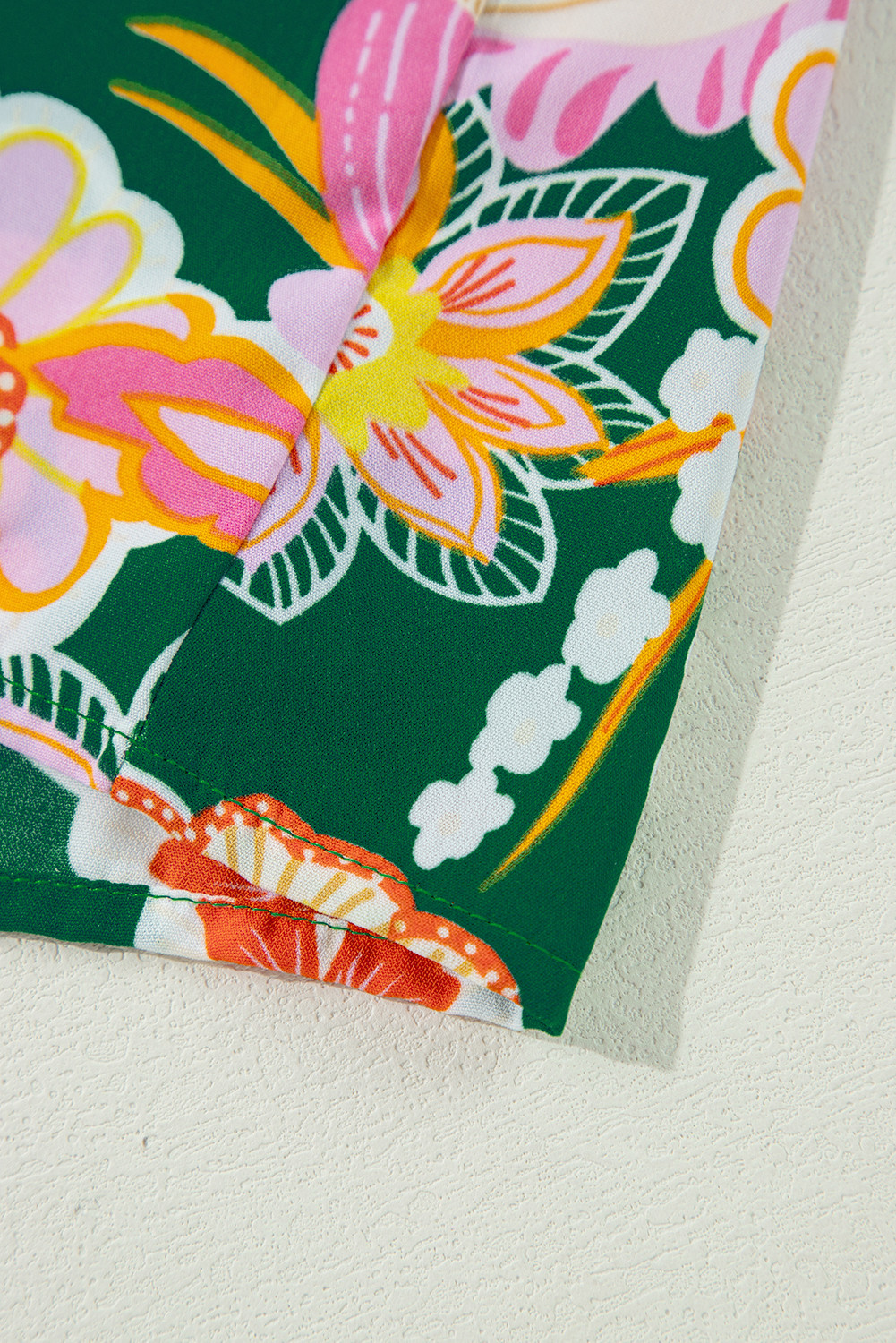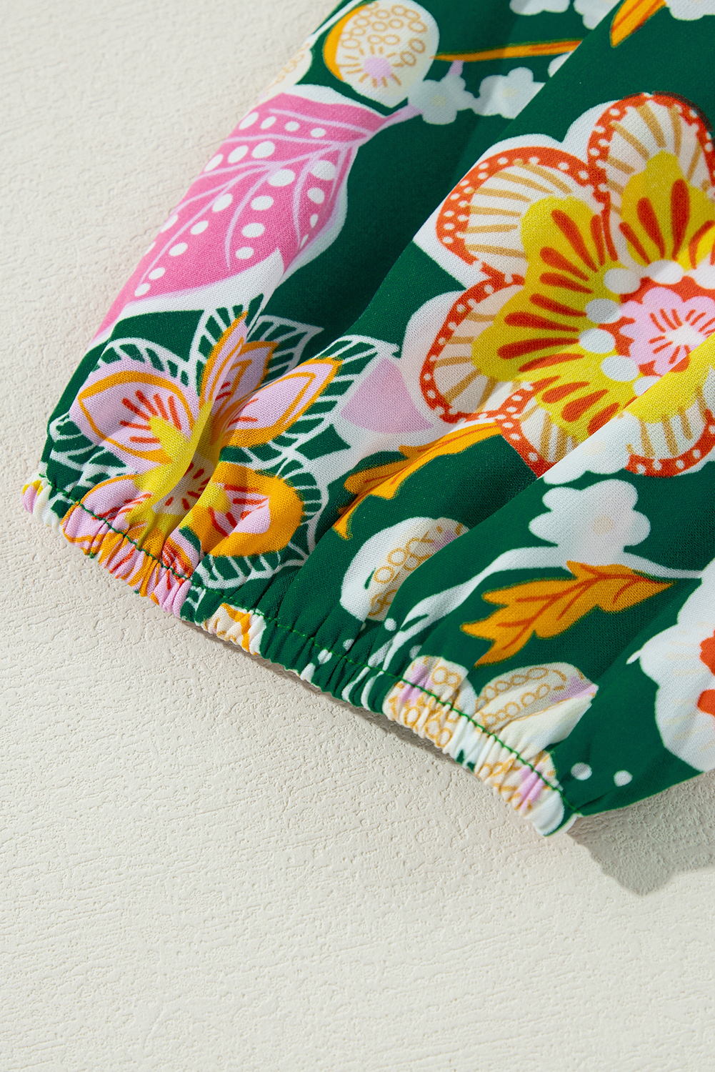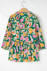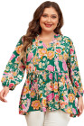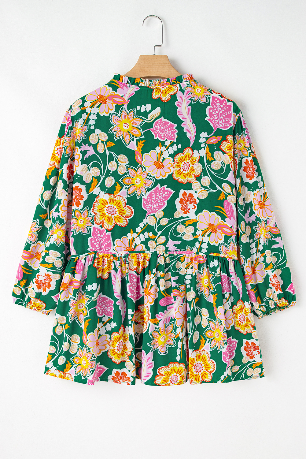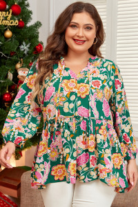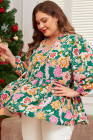Top babydoll de talla grande, manga larga, cuello en V y estampado floral verde