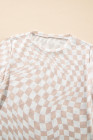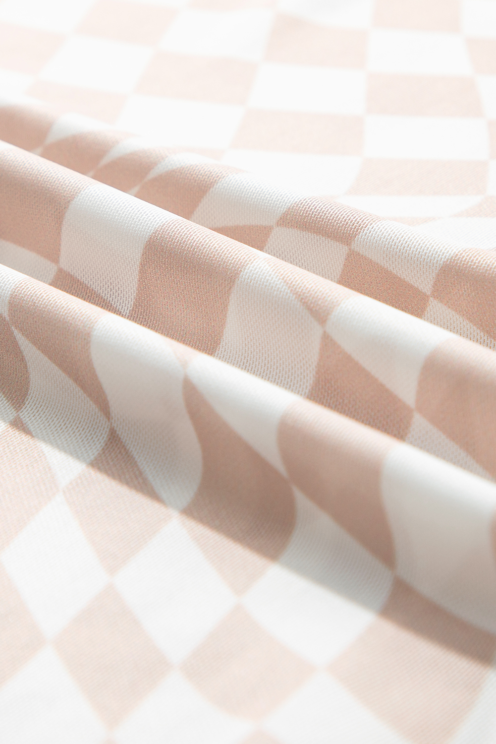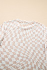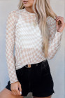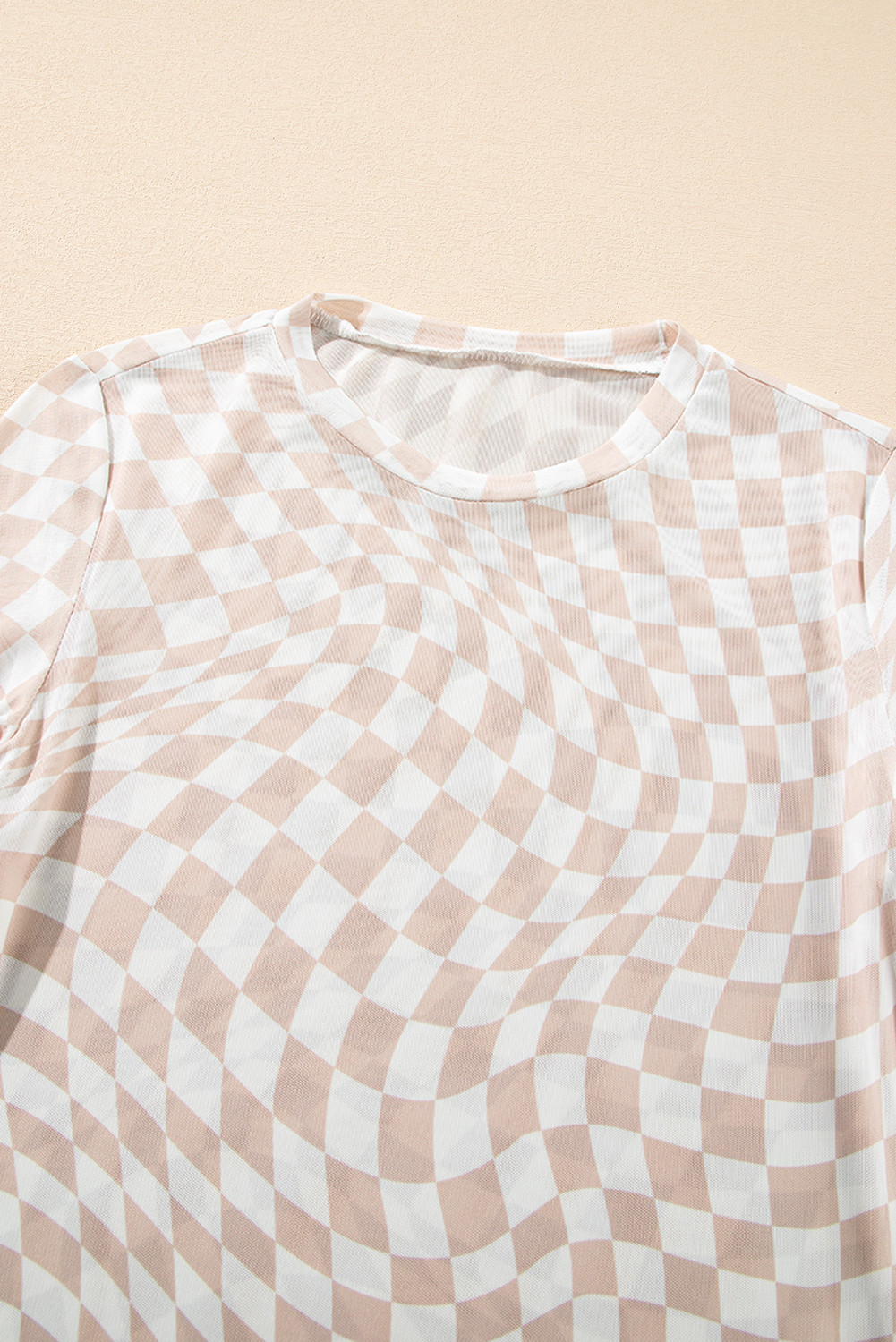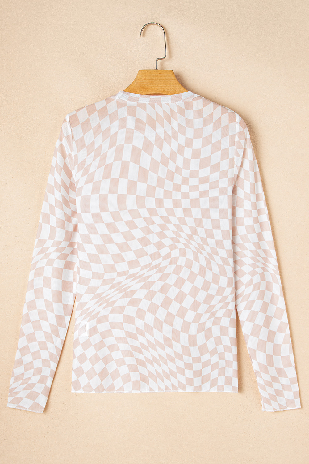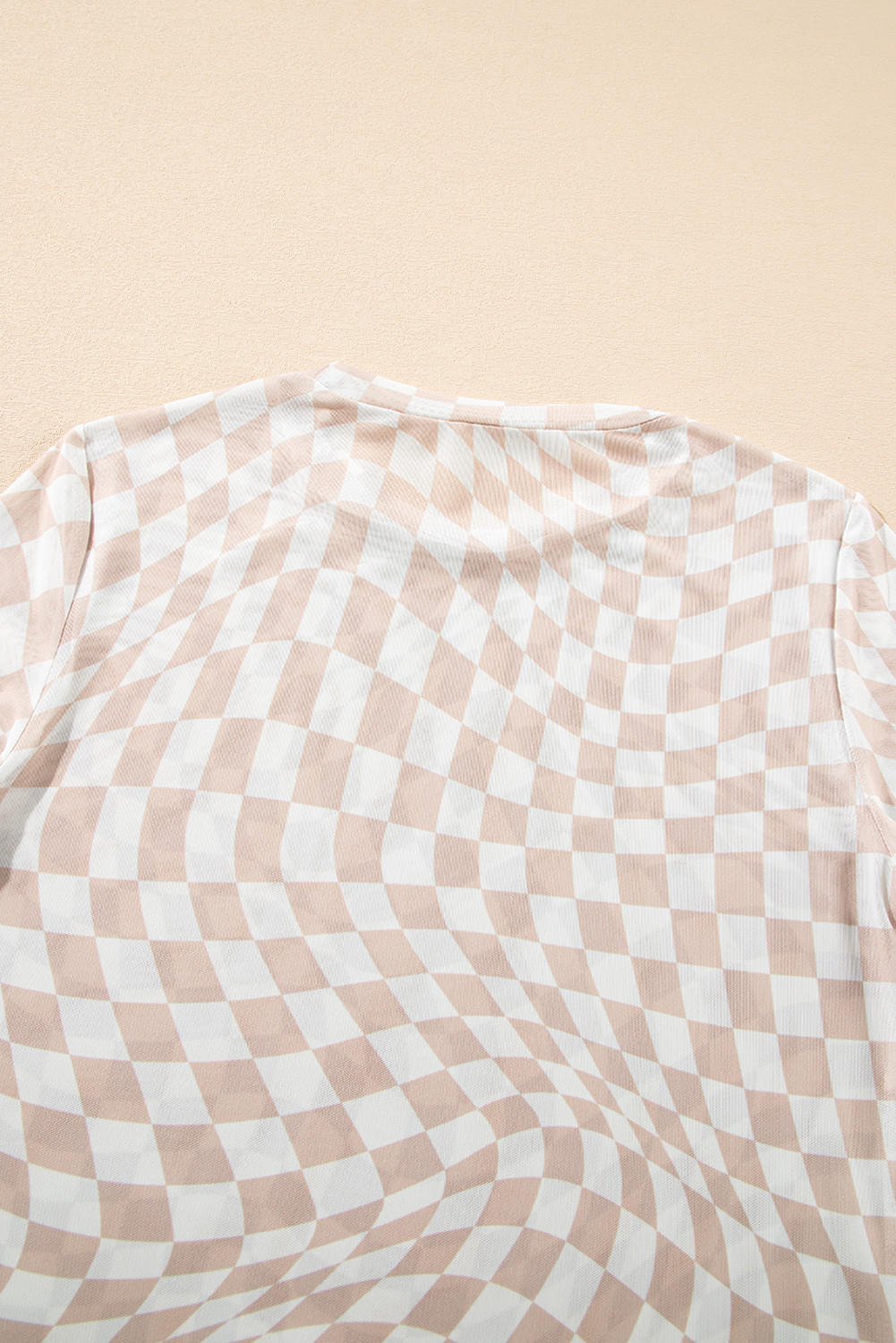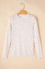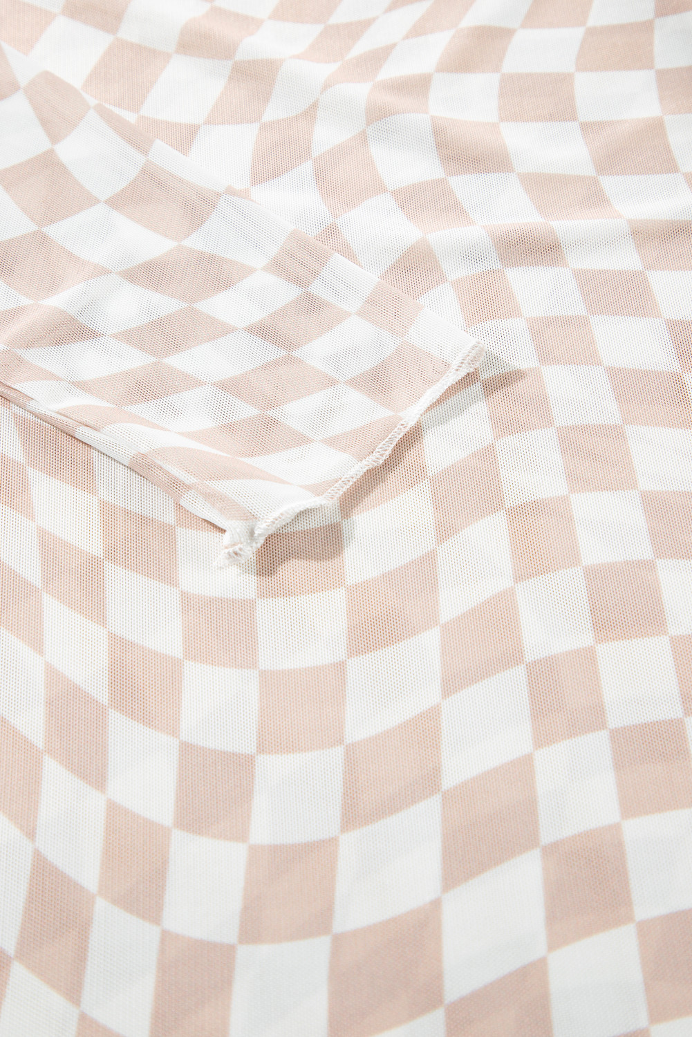 Blusa de manga larga con cuello alto y malla con estampado de cuadros color caqui